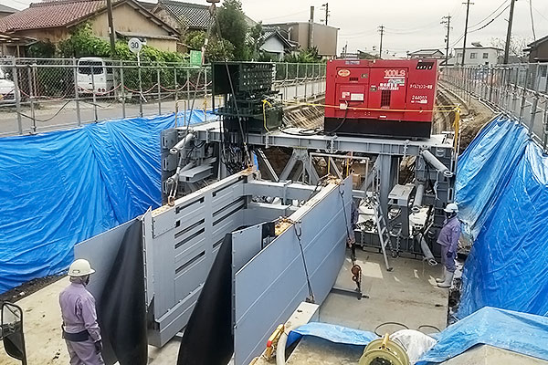 メッセル(鋼矢板)を1枚ずつ地中に押込んで前進する自走式であり、函体に反力を必要としません。そのため、函渠、開渠等の条件を選ばず、厳しい施工条件下で大きな威力を発揮します。