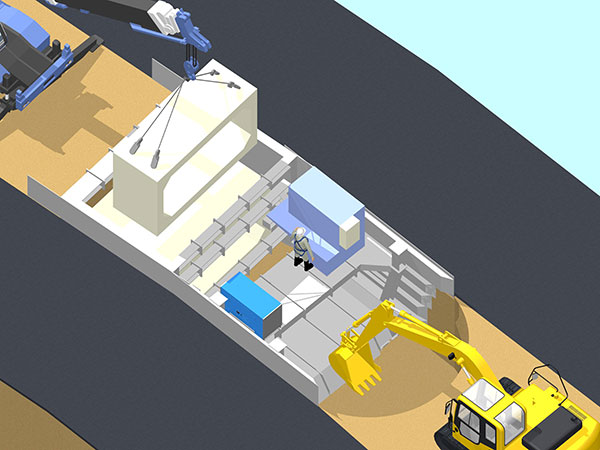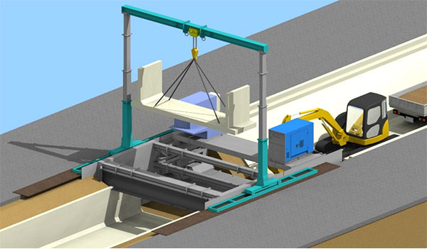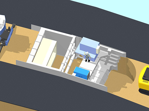 オープンピット工法は、「自走機能」を持つメッセルシールド機体を用いて、掘削・基礎・函渠の布設・埋戻を連続して行う、新しい「土留め工法」です。