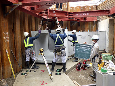 SCリフターは、画期的な自走能力を備え、従来のクレーンでは難しかった、狭隘部での作業やトンネル内、その他上空に架空線があるような現場でも、管(函)渠据付や重量物の移動・積降し作業などに活躍します。
